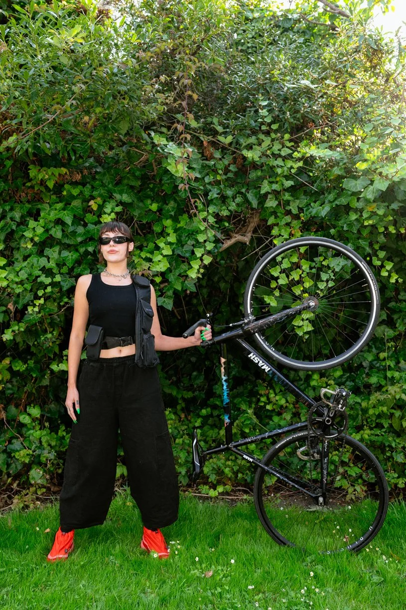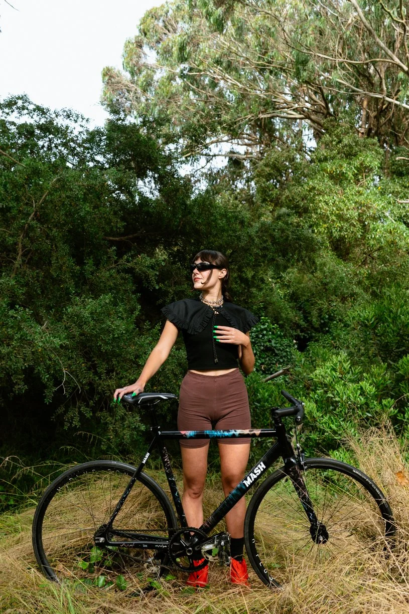 MASH SFLifestyle product photography of Emily with her custom Mash SF fixed gear bike, shot in San Francisco, CA.